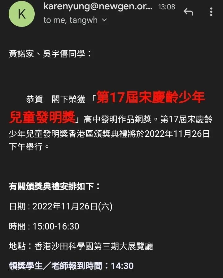 沈中BSC STEMLAB 學生獲「新一代文化協會」推薦代表香港參加國家科技部批准的,唯一以國家領導人名字命名的少年兒童科技活動,並列入教育部面向中小學生的全國性競賽活動名單「全國賽-宋慶齡少年兒童發明獎」。該比賽旨在落實立德樹人根本任務,引導青少年心懷科學夢想、樹立創新志向,為實現高水平科技自立自強培育人才。沈中學生以作品AIOT伴我同行,從兩岸暨港澳以及馬來西亞、菲律賓的3800多所學校,3萬多名參賽者提交的2萬多件作品中,入選265件(發明作品組別)獲得銅獎。