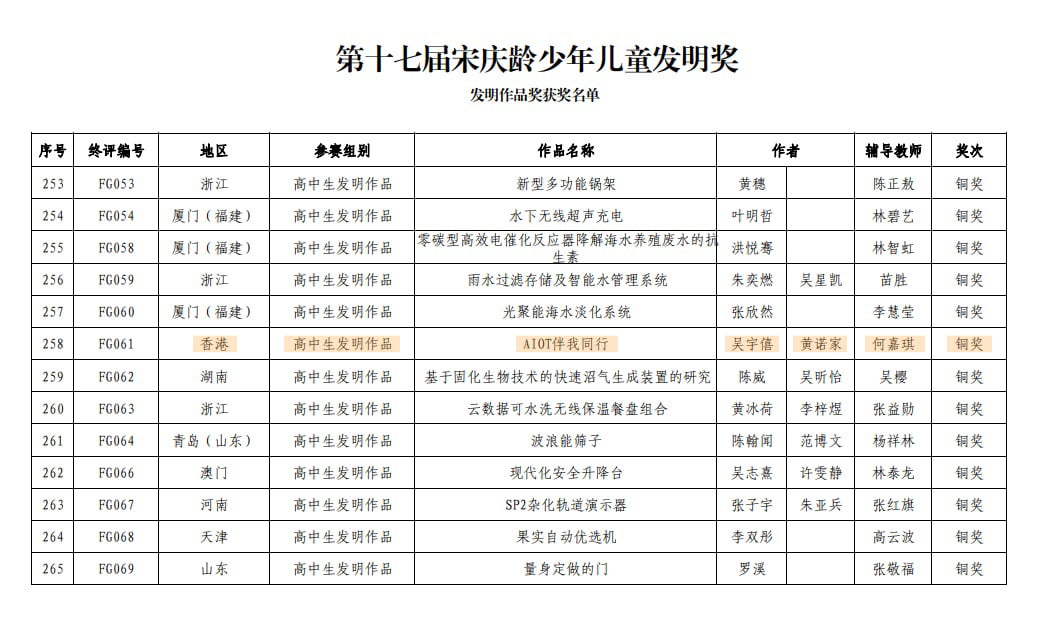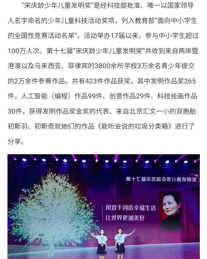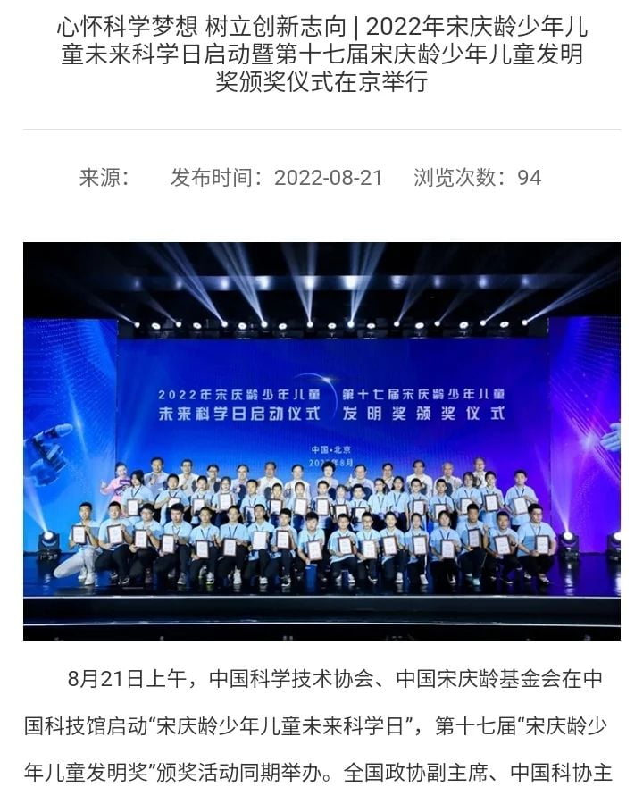 「第十七屆宋慶齡兒童發明獎」獲獎消息