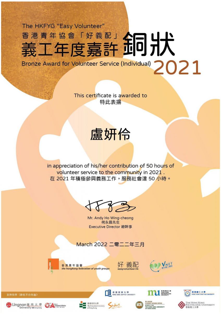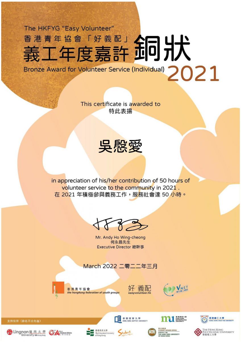 佛青團幹事及BSC STEMLAB義工服務時數達50小時,榮獲香港青年協會「好義配」義務工作嘉許Volunteer Service Award 2021 銅獎,12位得獎同學如下: