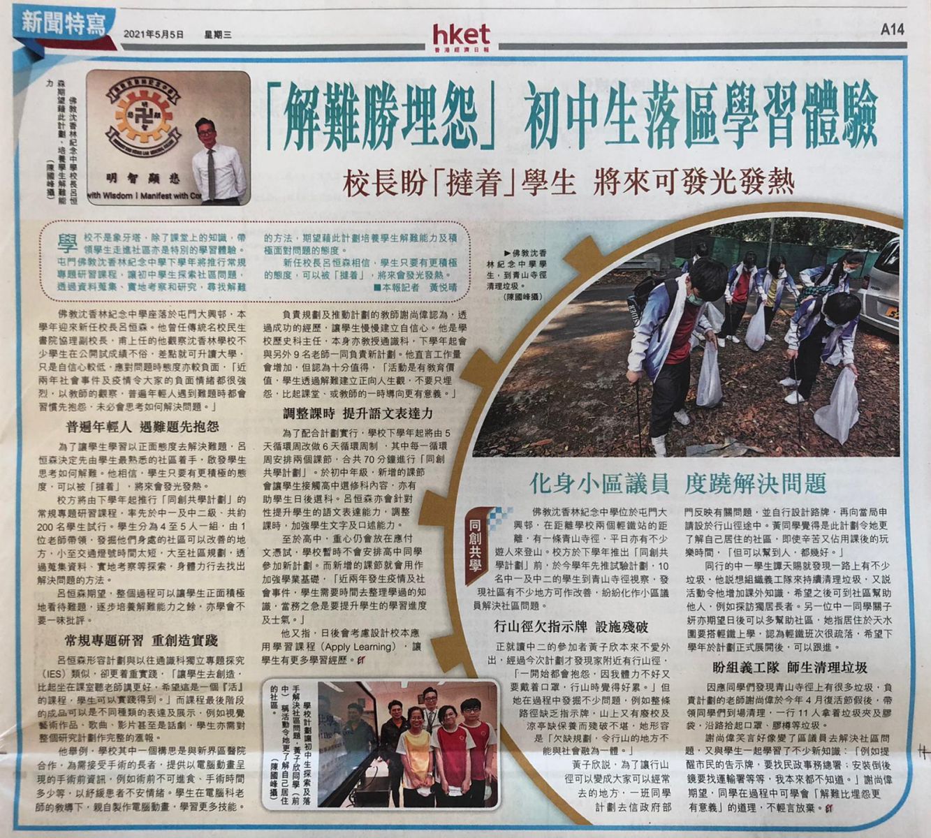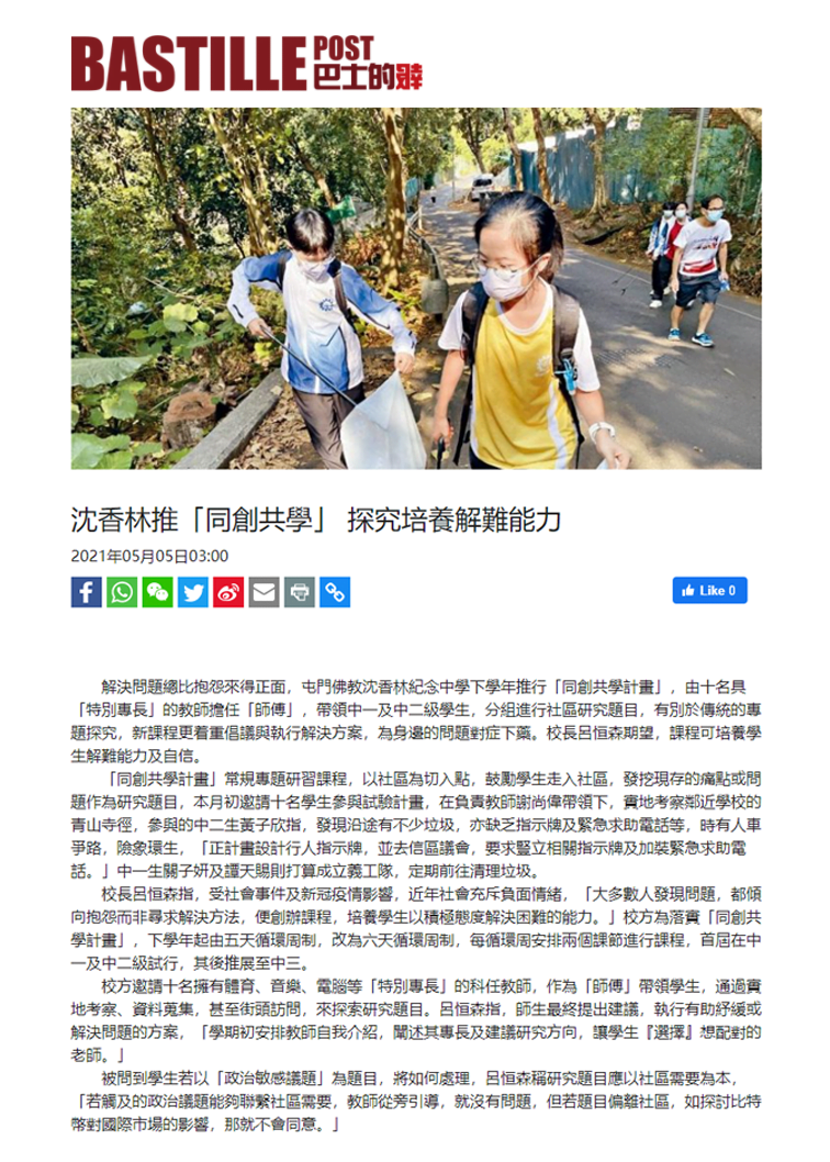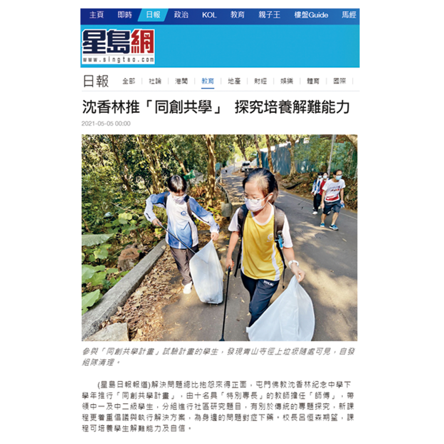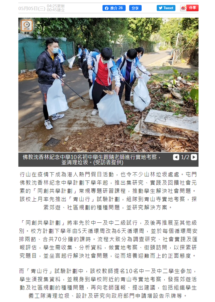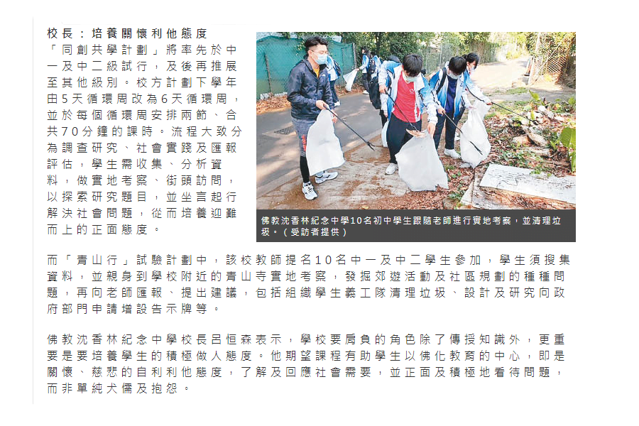 「同創共學」試驗計劃現已展開,十名中一及中二學生在謝尚偉老師帶領下到青山寺徑進行初步考察。此試驗計劃獲多間媒體報導,以下是各媒體報導的內容: