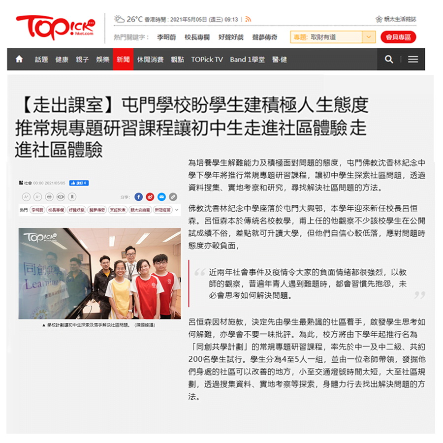 「同創共學」,推動實地考察,鼓勵初中同學了解社會,培養解難能力與正向價值觀