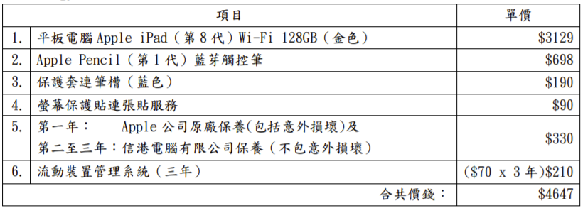 經採購程序,本校現確定向提供最低價錢的供應商「信港電腦有限公司」(Senco-Masslink Technology Ltd)訂購相關流動電腦裝置及相關配件,項目及價錢如下: