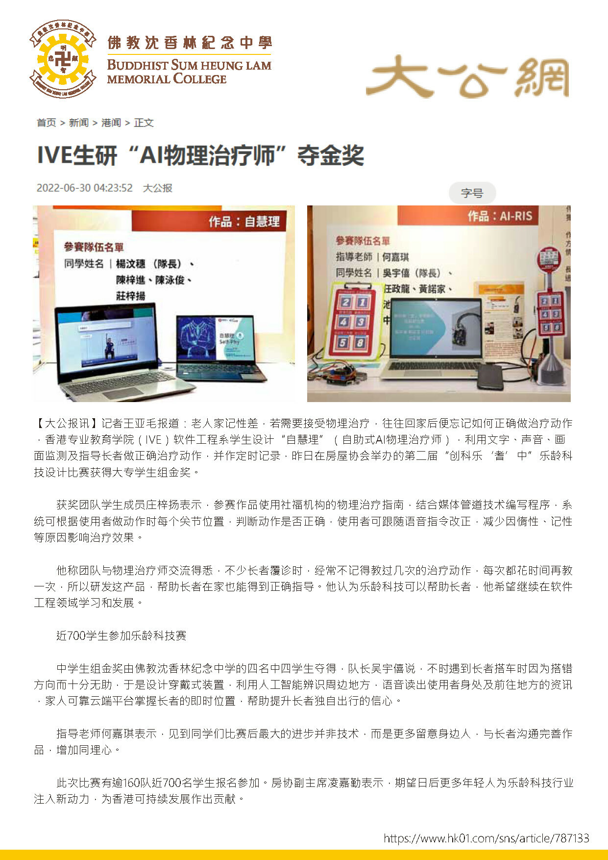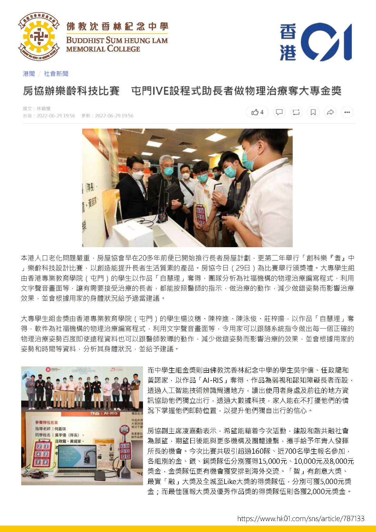 學生參加香港房屋協會(房協)「創科樂『耆』中」樂齡科技設計比賽 2021/22,同學AI作品從160隊隊伍680名學生中進入最後決賽5強,奪得獎項。