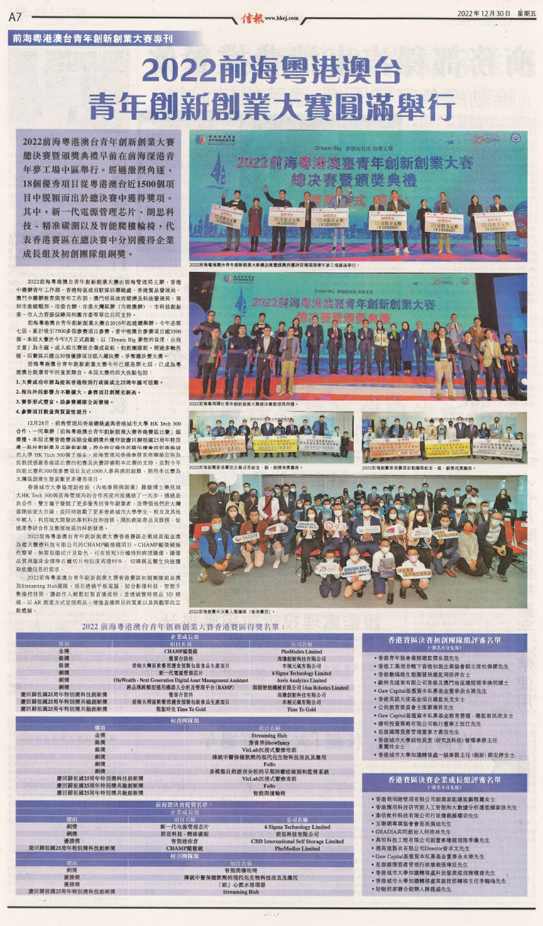 沈中BSC STEMLAB學生早前參與2022前海粵港澳台青年創新創業大賽總決賽暨頒獎典禮於信報報導,介紹本屆比賽獲獎項目。