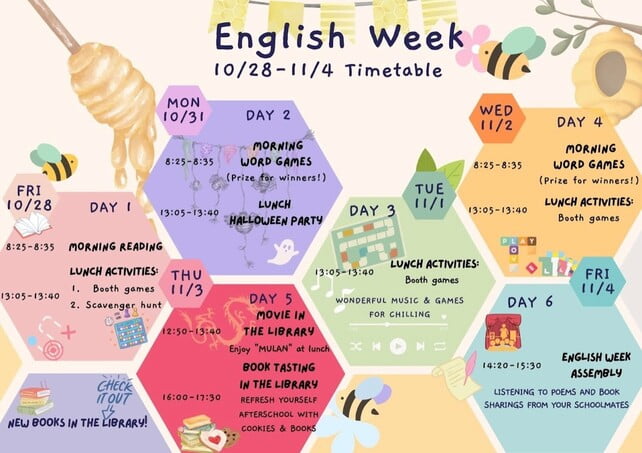 Amidst a busy first term for both students and teachers, the joyous English Week 2022 (28/10-4/11) was held. It offered a 6-day bundle of fun and engaging English activities as a means to enrich the English learning environment at BSC. These include morning word games, lunch games, Halloween Party, a whole-school poem reading and book sharing assembly, and book tasting with NETs. Students at BSC have had extra opportunities to immerse themselves to use English leisurely.