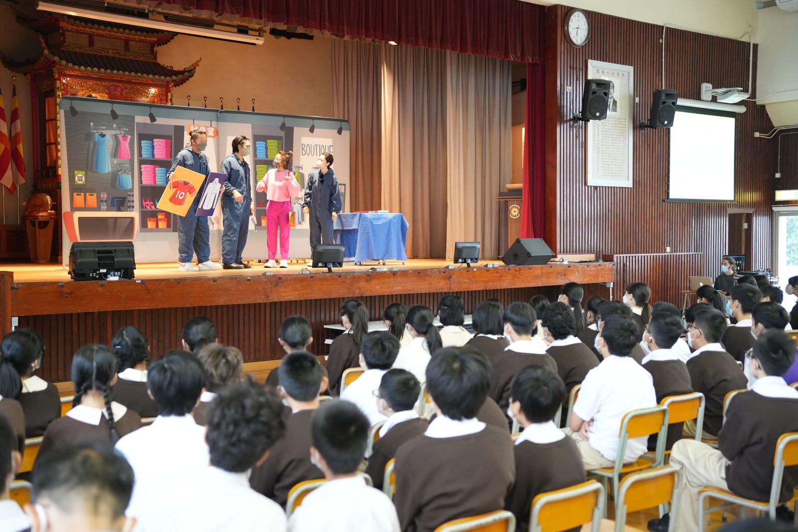 本校於11月8日(星期二)早會時段邀請了「遊劇場」到校進行劇場演出,劇場由語文教育及研究常務委員會支持及語文基金撥款贊助,演出的劇目是《真假售貨員》。