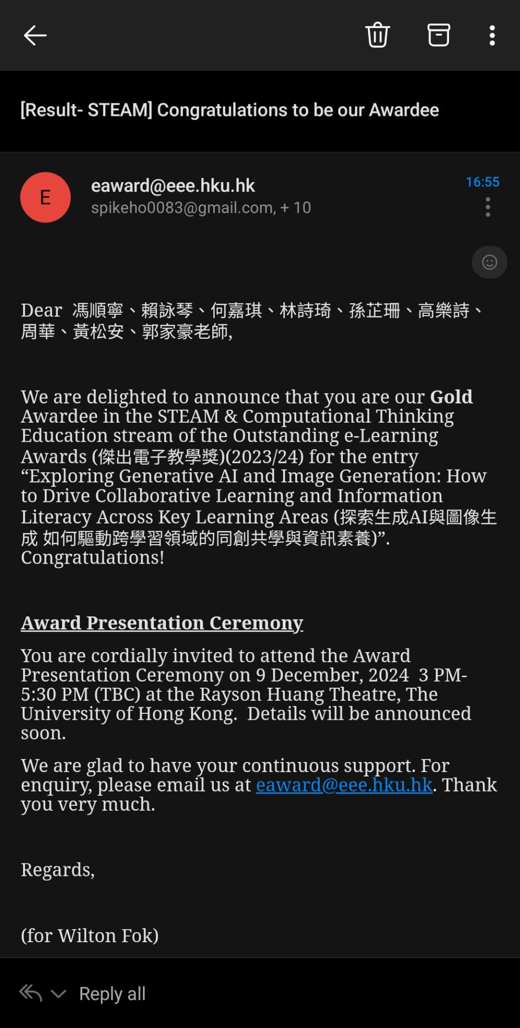 By 0Published On: 2024 年 10 月 17 日0Last Updated: 2024 年 10 月 29 日0Categories: ECO LAB, 媒體報導, 教師專業分享, 比賽獲獎及嘉許, 生成式人工智能教育0Total Views: 7840Daily Views: 000.2 min read012 words0