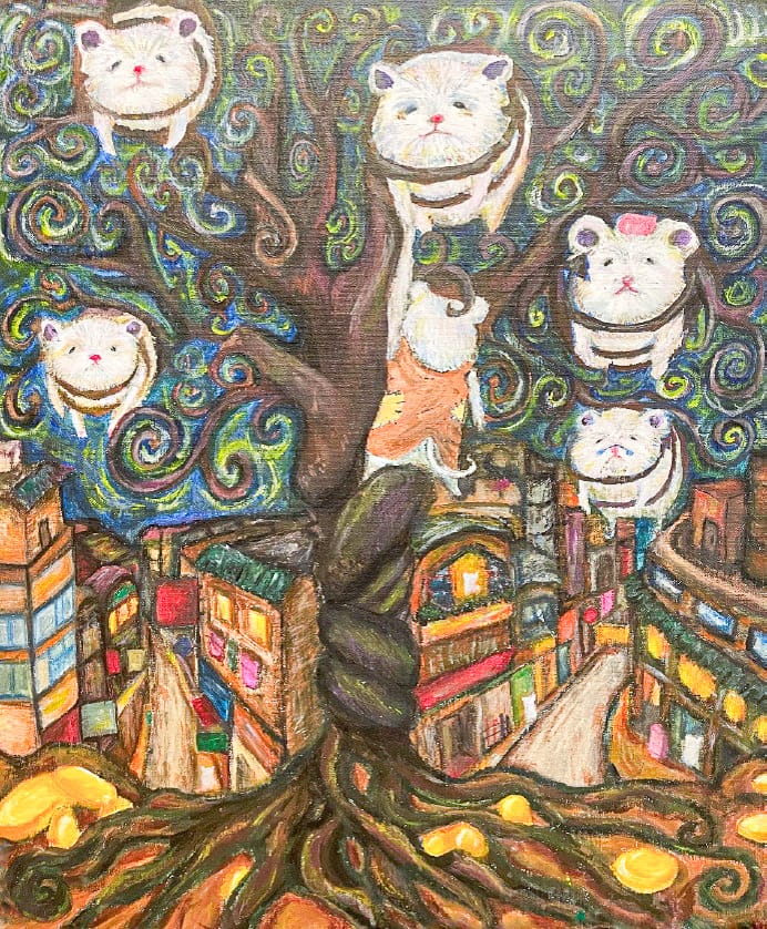 窮困潦倒的老鼠們生存環境並不富裕,扭曲的樹枝將牠們緊緊地纏繞着,使牠們無助地失去方向,無力反抗,也無法脫離。如現今社會,貧富差距的問題越來越嚴重,窮人面對社會上的不公及不安穩的生活,無法反抗,只能活在富人的支配下。
