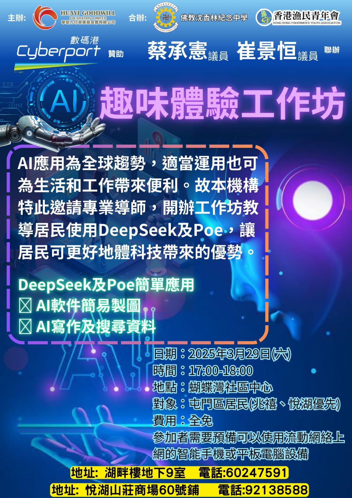 本次活動旨在透過輕鬆有趣的方式,讓居民掌握AI科技的基本應用,體驗智能技術為日常生活帶來的便利。歡迎屯門區居民踴躍參與,共同探索AI的無限可能.