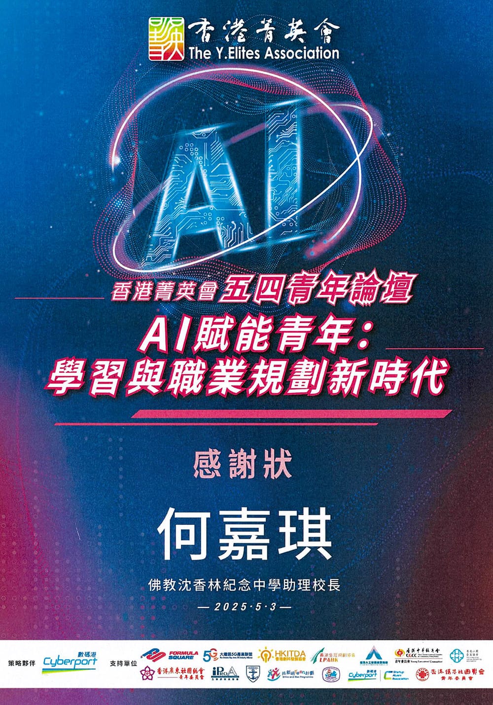 [教師專業分享]創新學習委員會助理校長何嘉琪獲香港菁英會邀請出席「五四青年論壇」,今年主題為「AI賦能青年:學習與職業規劃新時代」,並擔任「AI分享論壇」講者。