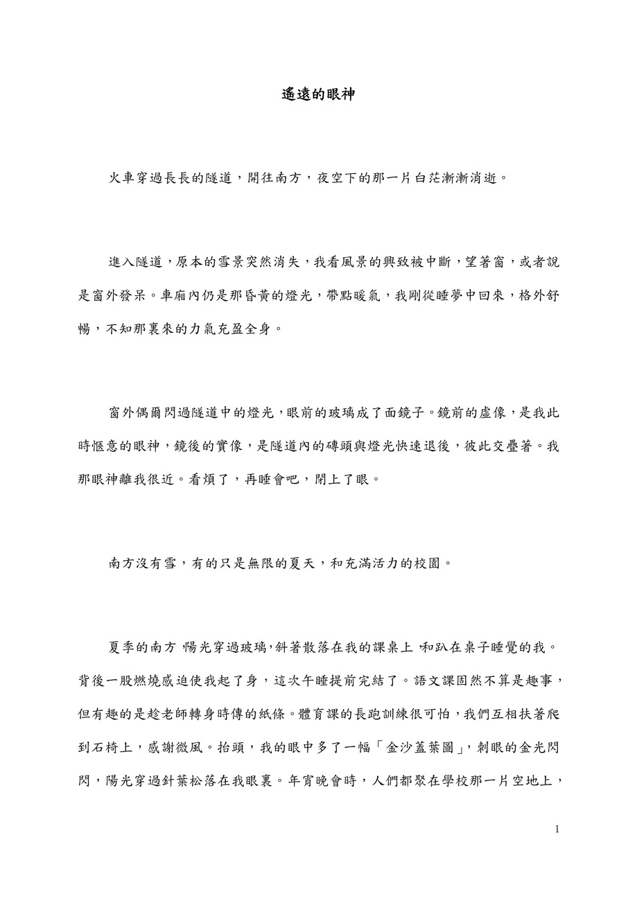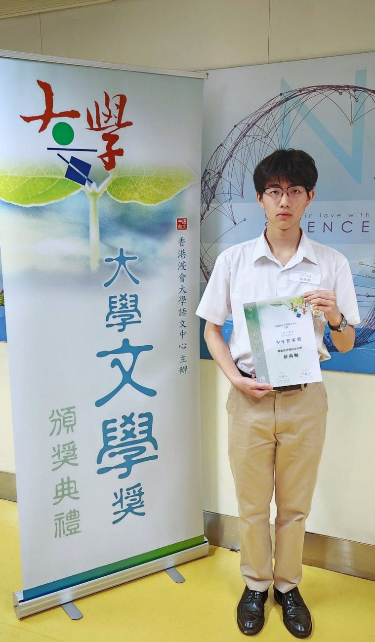 本校中文科一直鼓勵學生創作,學生於公開徵文比賽中亦屢獲殊榮。日前,4C班薛禹楓同學於香港浸會大學語文中心主辦之「第十三屆大學文學獎」中,憑藉作品〈遙遠的眼神〉脫穎而出,獲「少年作家獎」。薛同學日常喜愛閱讀日本文學,本文是他於校內作文比賽的得獎作品,模仿日本作家芥川龍之介的《橘子》一文寫成,嶄露頭角。期望他能保持對創作文學的熱誠,以筆尖創作更多獨特的作品。以下為頒獎禮相片及薛禹楓同學之散文作品。