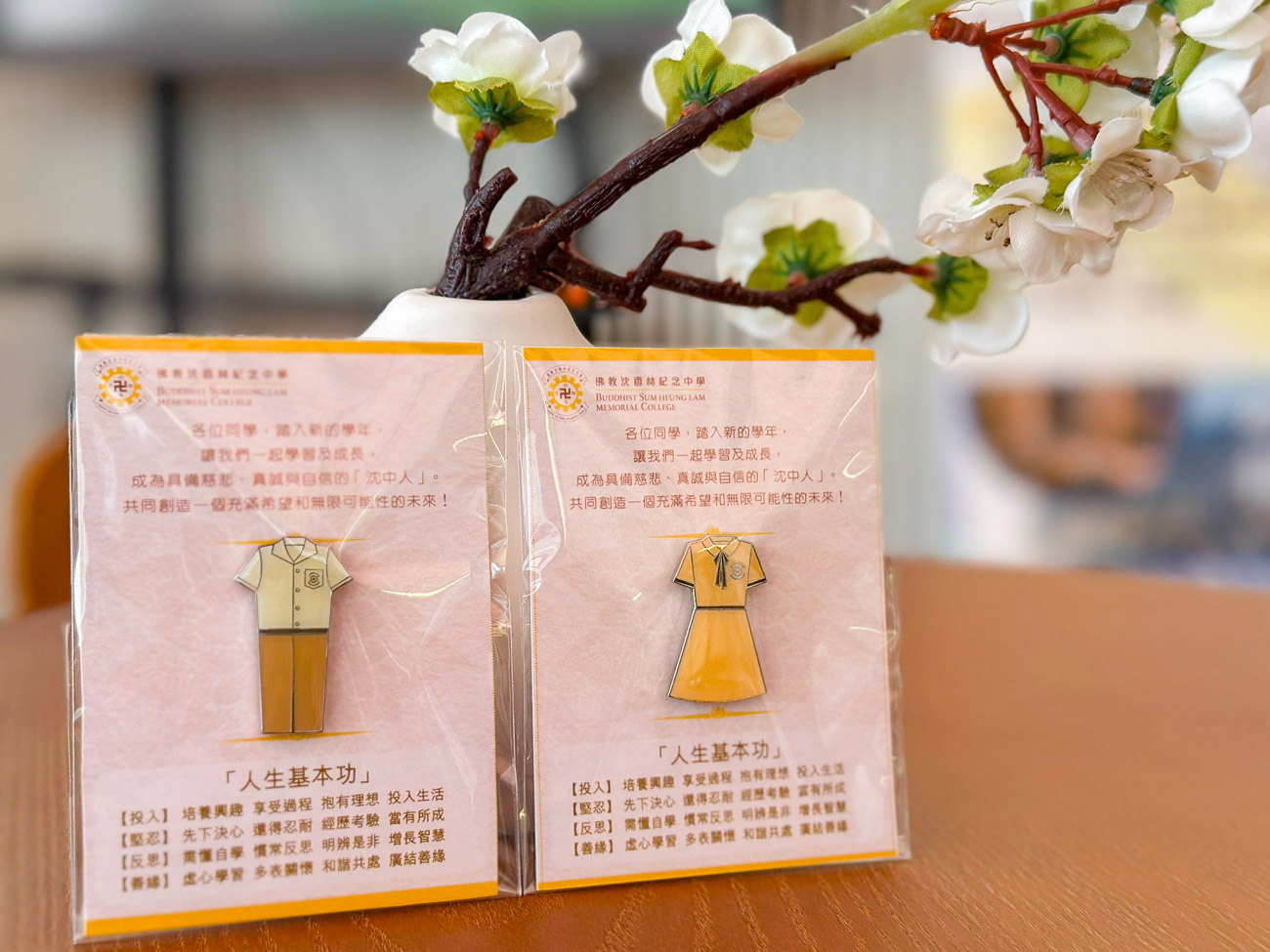 為讓中一新生真切感受沈中的溫暖與關懷,學校精心準備入學小禮物 ——「沈中人襟章」,贈予每位中一新生。襟章上除載有誠摯的開學祝福外,更印上校監衍空法師的「人生基本功」,期望新生能銘記「投入」、「堅持」、「反思」、「善緣」的人生態度,在中學階段奮發向上、篤行不怠。