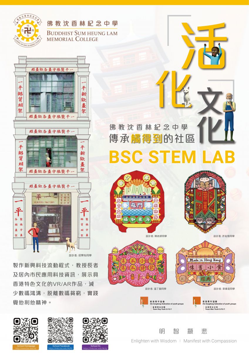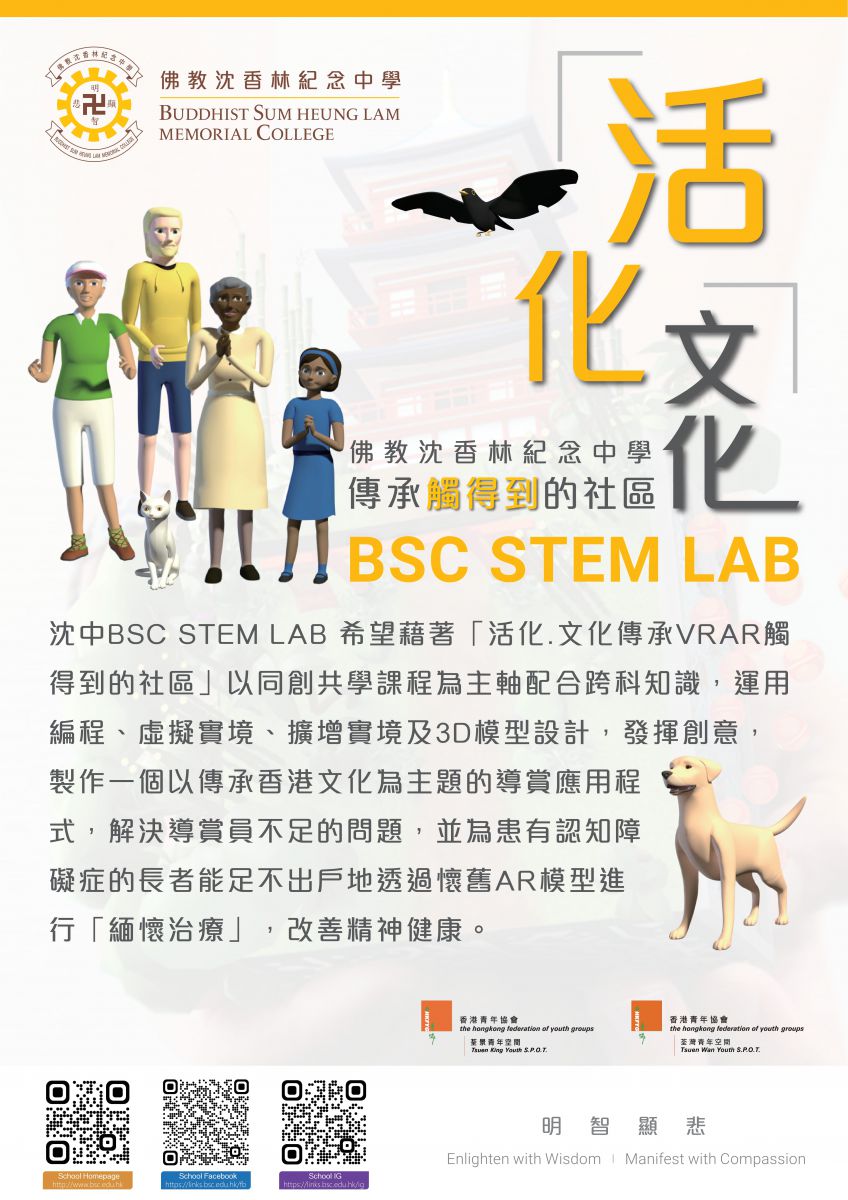 「活化.文化傳承VRAR觸得到的社區」以本校校本課程「同創共學」為主軸配合跨科知識,由學生運用編程、虛擬實境、擴增實境及3D模型設計,發揮創意,製作一個以傳承香港文化為主題的導賞應用程式,解決導賞員不足的問題,並為患有認知障礙症的長者能足不出戶地透過懷舊AR模型進行「緬懷治療」,改善精神健康。