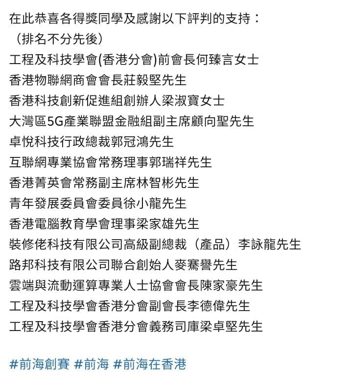 2022前海粵港澳台青年創新創業大賽香港區比賽(中學組)得獎名單如下: