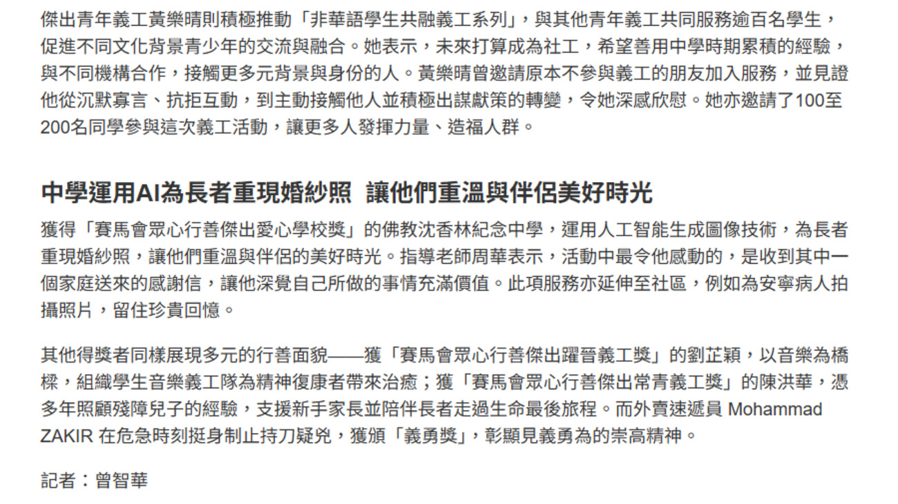 獲得「賽馬會眾心行善傑出愛心學校獎」的佛教沈香林紀念中學,運用人工智能生成圖像技術,為長者重現婚紗照,讓他們重溫與伴侶的美好時光。指導老師周華表示,活動中最令他感動的,是收到其中一個家庭送來的感謝信,讓他深覺自己所做的事情充滿價值。此項服務亦延伸至社區,例如為安寧病人拍攝照片,留住珍貴回憶。