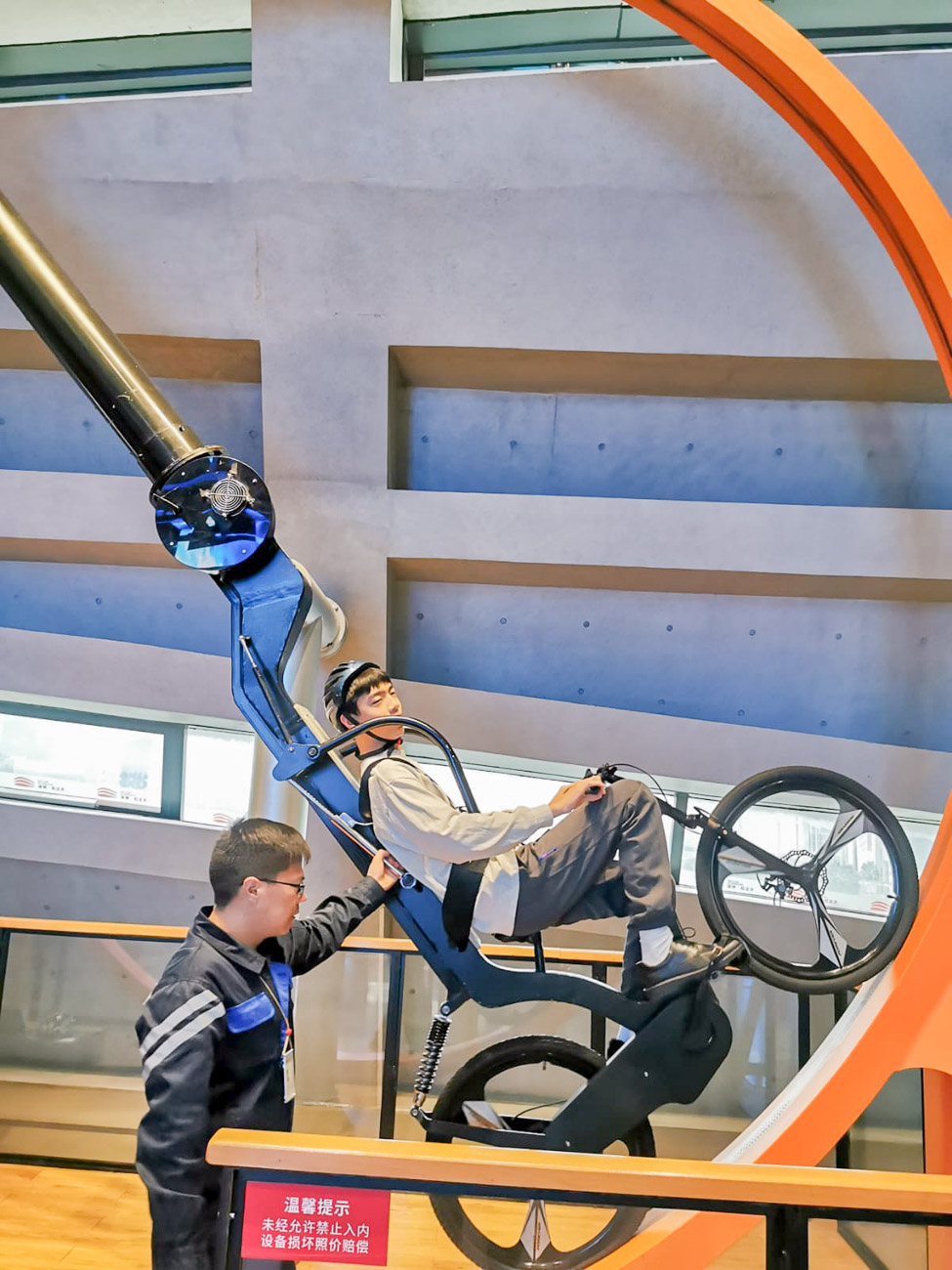 次日,我們到訪深圳紅立方科學館,場館滿布通透玻璃幕牆,陽光穿透幕牆傾瀉而下,暖光灑在身上,光影流轉間宛若置身未來世界。貫穿五層的扶手梯搭配霓虹光影,科技感撲面而來。我們在五樓體驗颱風、地震模擬,試玩360度自行車,又擺弄各類精巧的科學小裝置,在動手互動中輕鬆領悟簡單的科學原理,真切感受科學的神奇趣味。三樓的人工智慧場館更令人驚歎,會彈琴、還原魔方、能與人類對話的AI,雖肢體稍顯僵硬,卻盡顯科技的強大力量,讓我們預見其未來的無限可能。