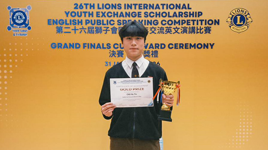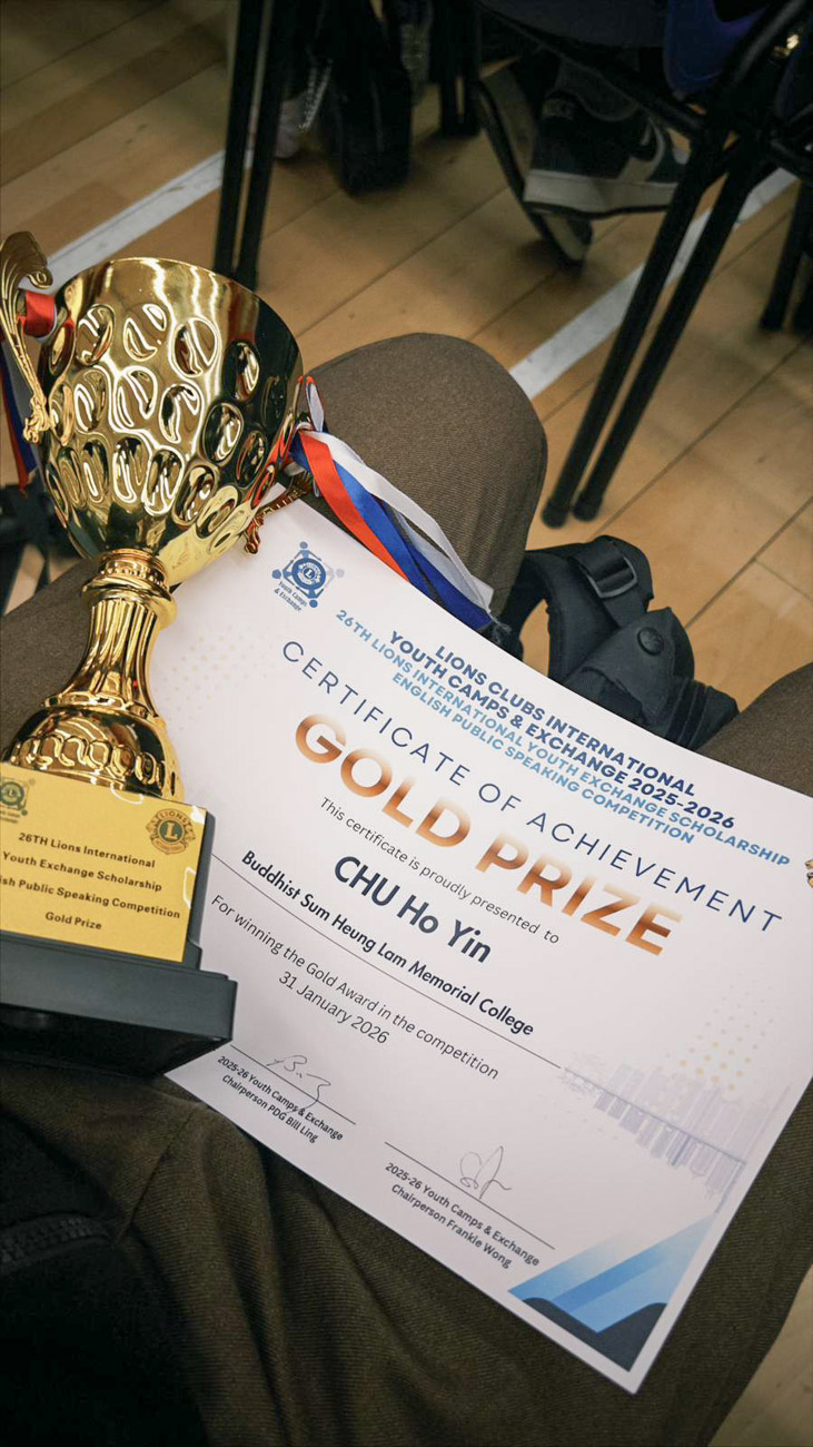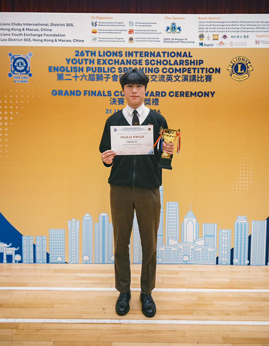 本校英文科傳來令人振奮的佳績!5C班朱浩然同學在「第 26 屆獅子會國際青年交流英文演講比賽」中表現卓越,榮獲金獎殊榮。這份榮譽得來不易,浩然平日對英文學習充滿熱忱,備賽期間更是勤奮練習,不斷磨練演講技巧;同時,特別感謝關老師的悉心指導,從稿件構思到台風訓練皆傾注大量心血,帶領學生突破自我。是次比賽競爭激烈,浩然與多所傳統名校,包括聖公會林護紀念中學、英皇書院、真光女書院、協恩中學及拔萃女書院的優秀學生同台競技並共同獲獎,充分展現了本校學生的競爭力與大將之風。再次祝賀朱浩然同學,期待他繼續在語言學習的道路上大放異彩!