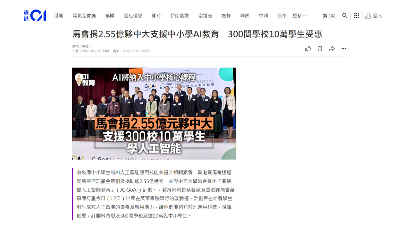 原文網址: 馬會捐2.55億夥中大支援中小學AI教育 300間學校10萬學生受惠 | 香港01 https://www.hk01.com/article/60330005?utm_source=01articlecopy&utm_medium=referral