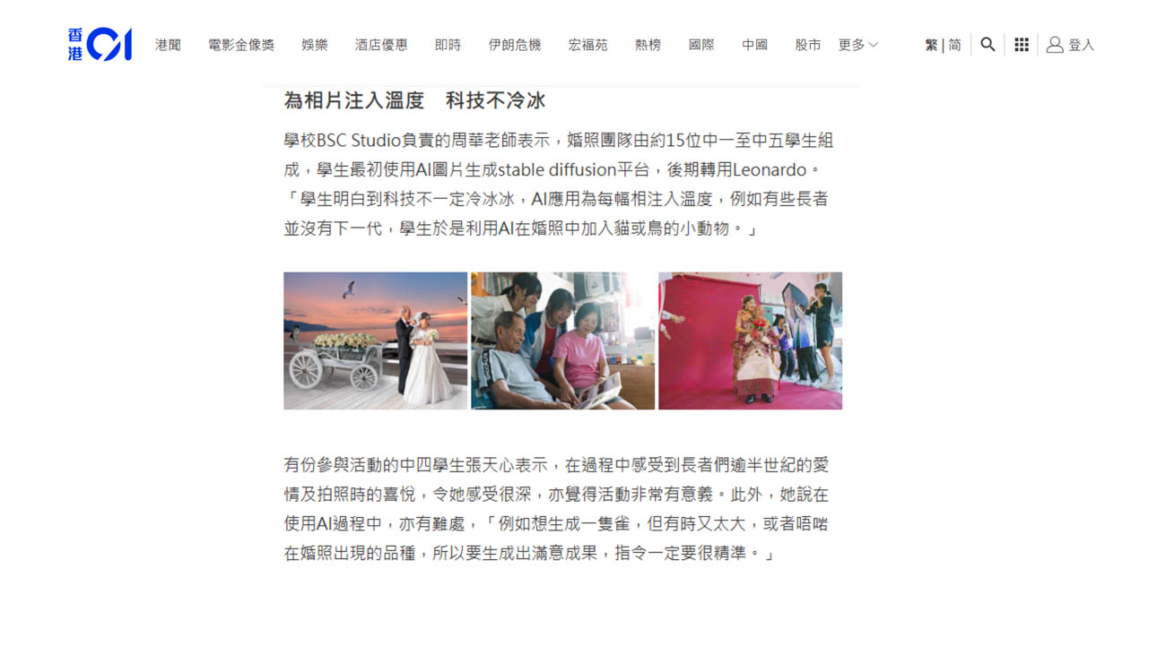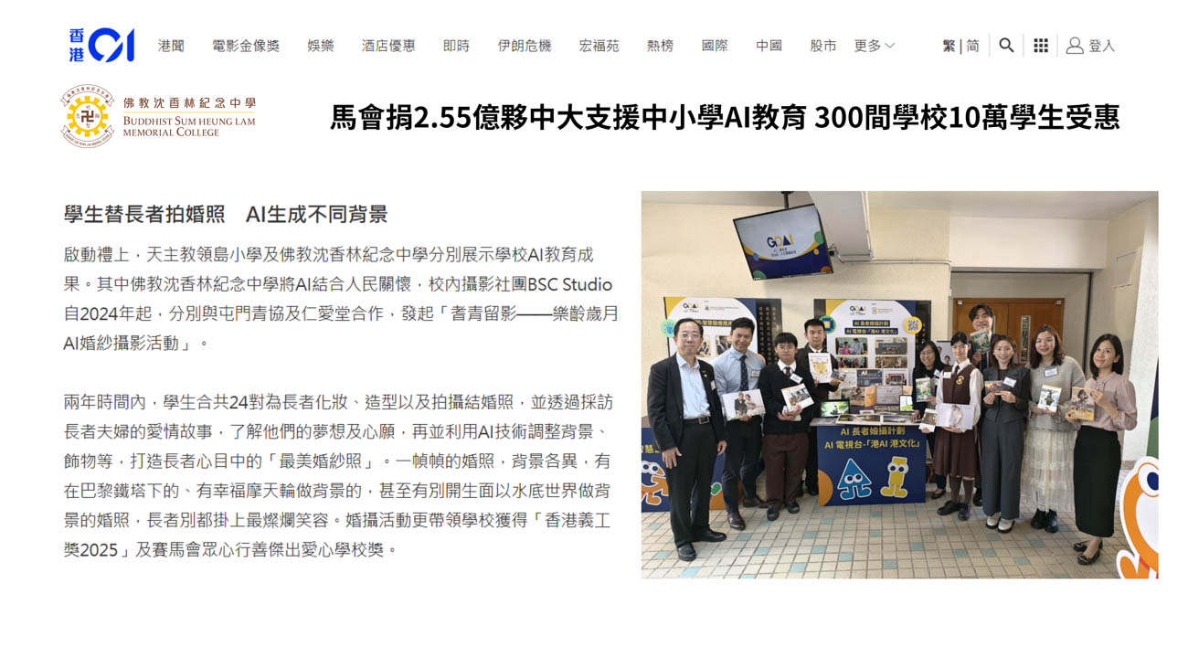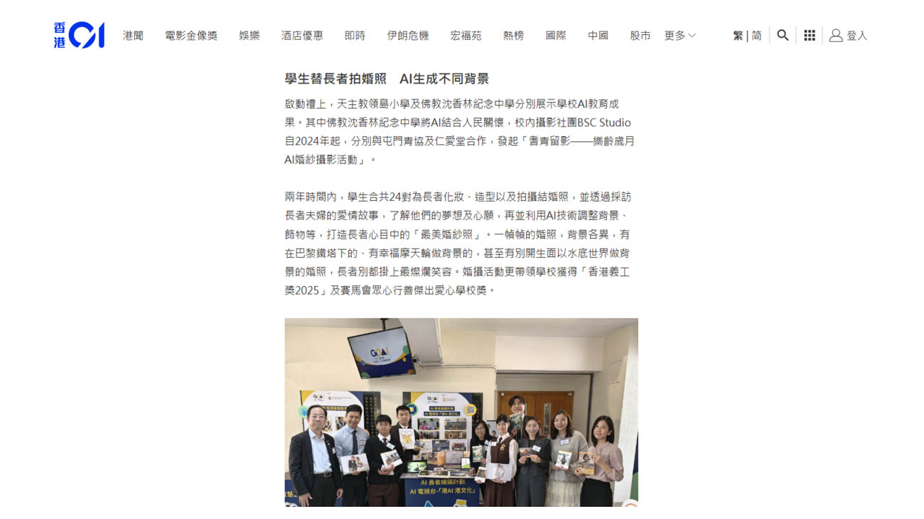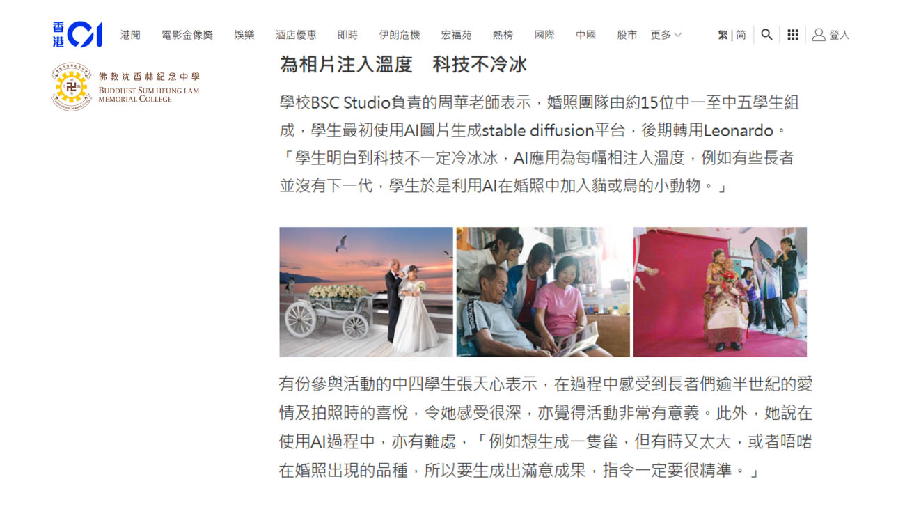 在「賽馬會人工智能教育」(JC GoAI)計劃啟動禮上,佛教沈香林紀念中學(BSC)展示了令人動容的 AI 教育成果。學校將人工智能技術與人文關懷深度結合,由校內攝影社團 BSC Studio 聯同 BSC Community 發起「耆青留影——樂齡歲月 AI 婚紗攝影活動」,利用科技為長者重拾青春記憶,實現未竟之志。