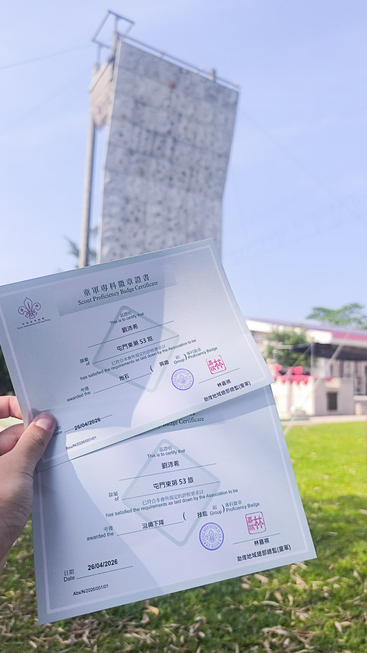這項專章訓練極具挑戰性,不僅考驗個人的體能,更要求高強度的心理素質。劉沛希展現出極強的獨立性與目標感,他獨自一人穿梭於多個專業訓練場地,包括位於新界的鄧肇堅男女童軍中心、西灣河協青社的「城市之峰」,以及西貢白沙灣王兆生領袖訓練中心。從室內抱石的指力與路線規劃,到戶外沿繩下降對心理恐懼的克服,每一站都見證了他的成長。