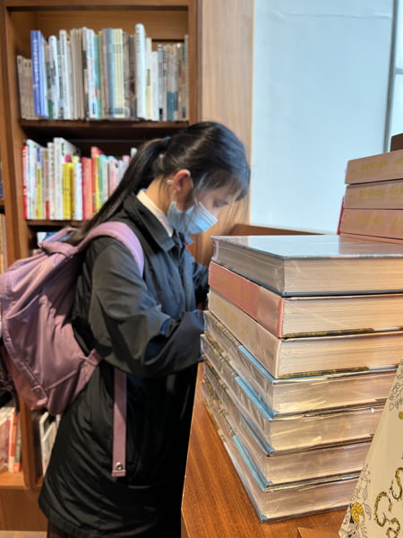 同學們為圖書館選購自己喜愛書藉,大家都能分享閱讀的樂趣。最後,眾人滿載而歸,心生歡喜,活動圓滿成功,感恩學生積極參與。