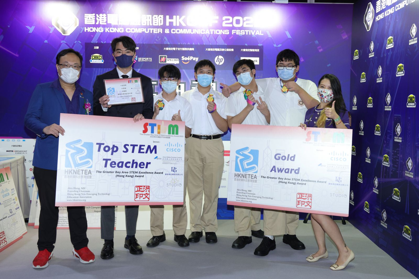 沈中何嘉琪老師與4位學生代表學校參加由教育局及政府資訊科技總監辦公室支持、「香港新興科技教育協會」主辦之2022年大灣區STEM卓越獎(香港區) ,從1500名參賽者中脫穎而出,勇奪以下獎項,八月二十二日何嘉琪老師與4位學生到會展出席頒獎禮:
