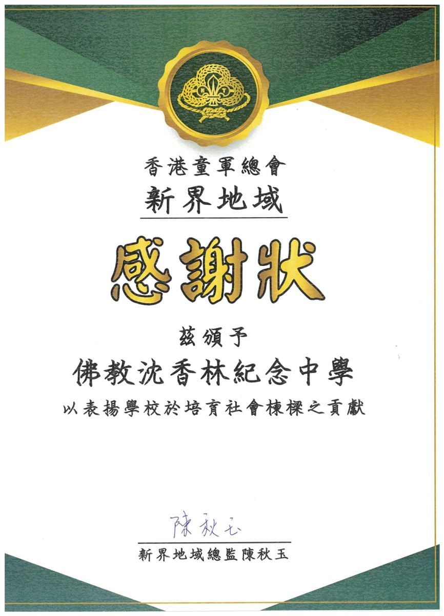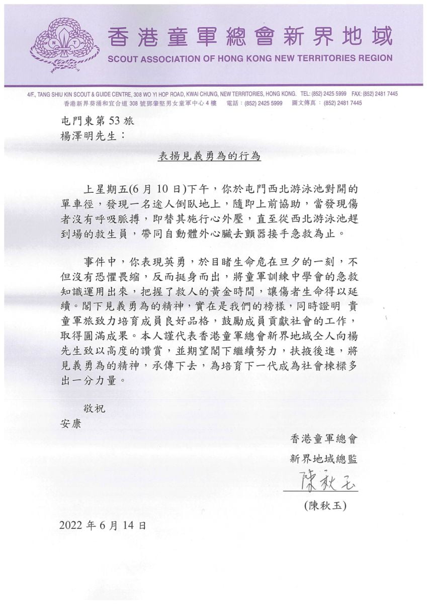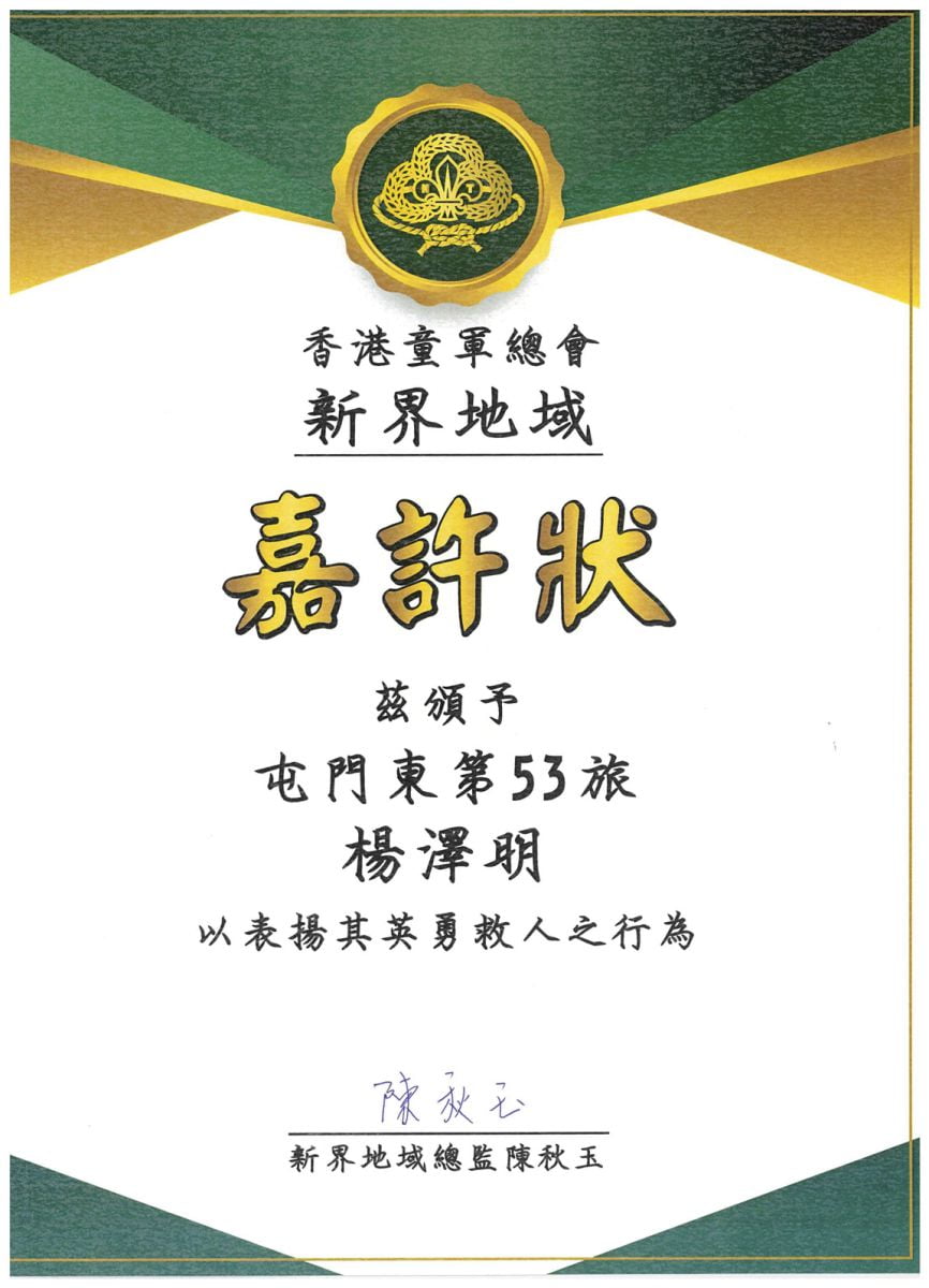 楊同學自中一起參加本校童軍團,現為屯門東區53旅童軍支部小隊隊長,一直有接受相關急救訓練。楊同學年紀輕輕,目睹生命危在旦夕的一刻,仍然臨危不亂,挺身而出,將童軍訓練中學會急救知識運用出來,把握了救人的黃金時間,救人於危難之間,實在是童軍及本校同學的楷模,值得表揚。