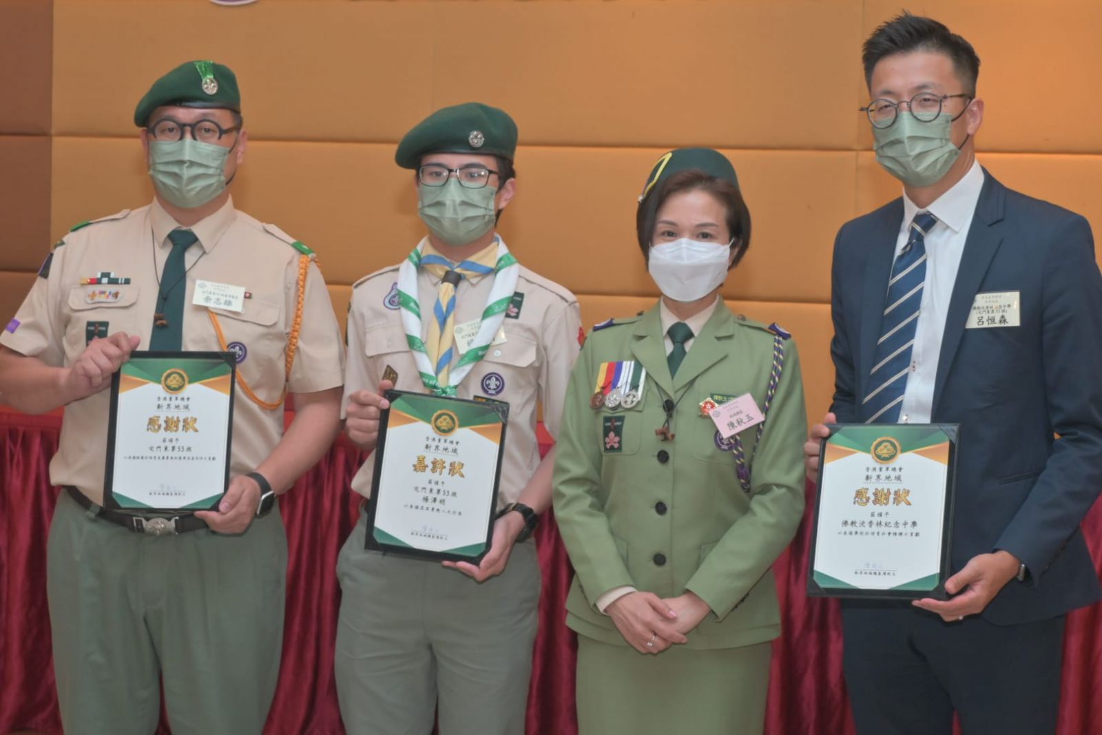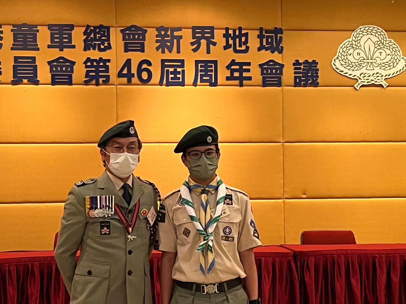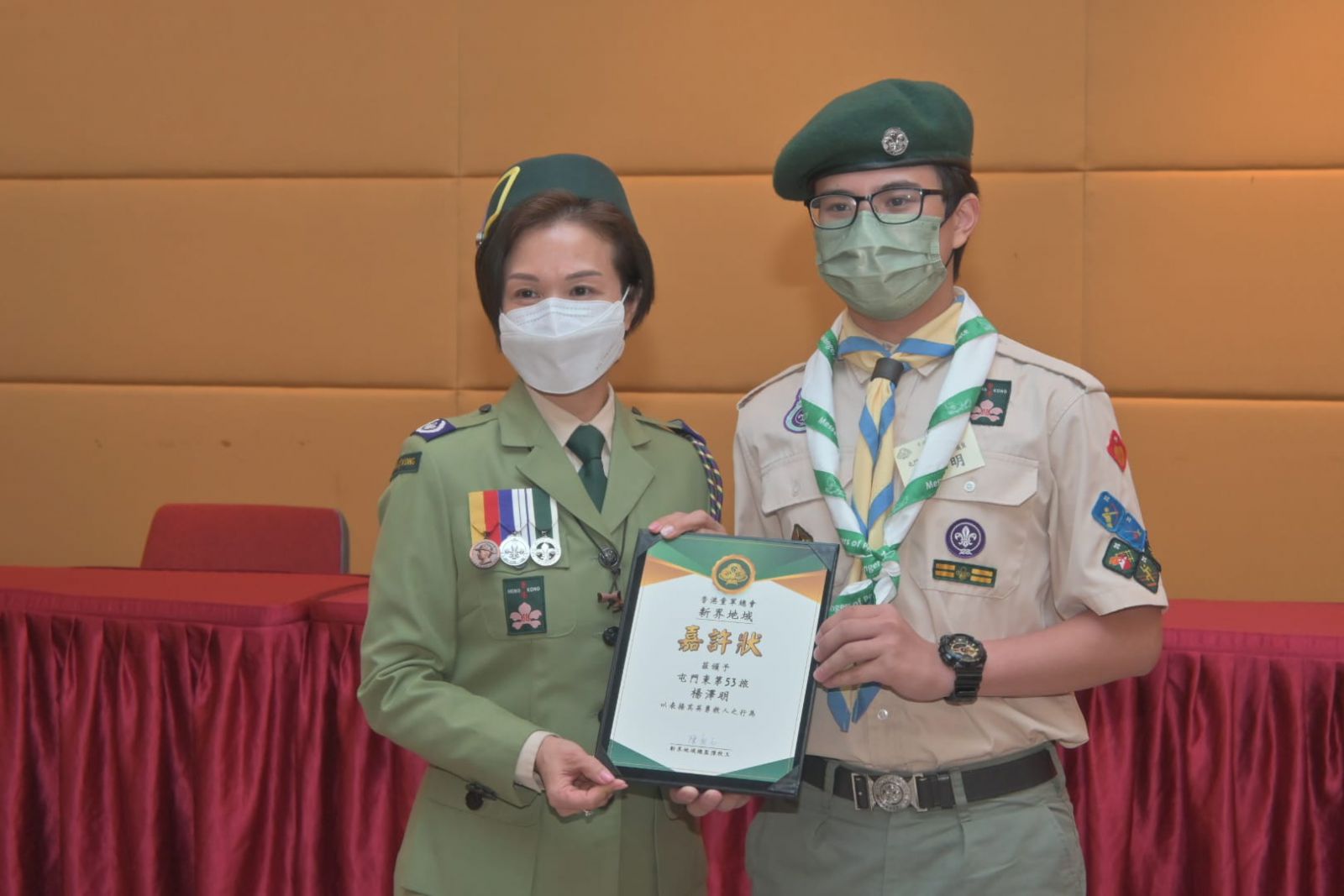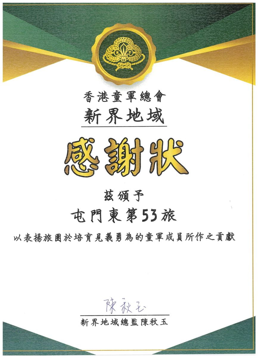 在二零二二年六月廿四日香港童軍總會新界地域周年會議中,楊同學接受副香港總監(活動與訓練)吳家亮總監頒發和平使者領巾。
