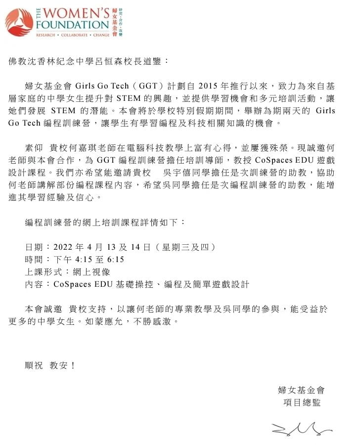 何嘉琪老師獲婦女基金會邀請擔任「Cospaces EDU Coding Boot Camp」培訓導師,教授27名來自不同學校的中三至中五基層女學生,利用編程製作VR/AR元宇宙世界。本校學生吳宇僖同學亦被邀請擔任訓練營當日的助教。