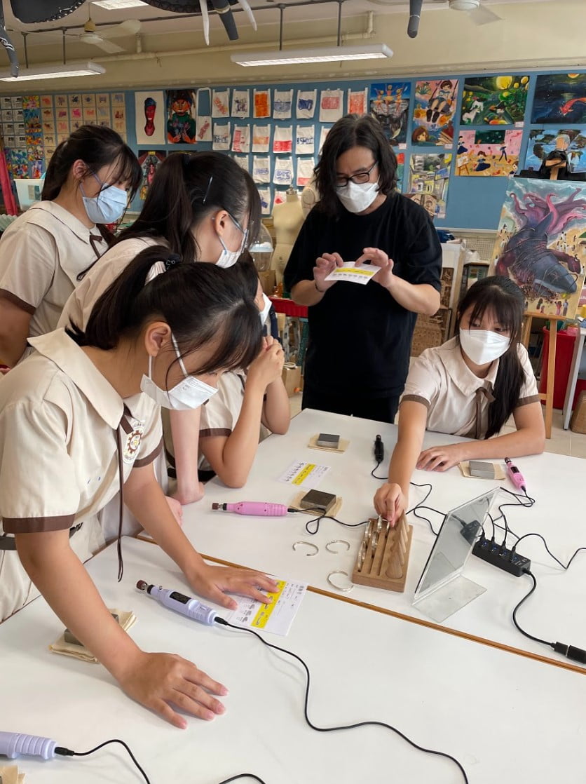 為了提升學生對飾物設計製作的知識與技巧,10位高中視覺藝術科參加了一銀手鐲製作班首飾金工班。學生於工作坊中不但實踐銀飾基本製作技巧,包括用吊磨機刻上紋路等,亦可認識銀飾的保養方法。