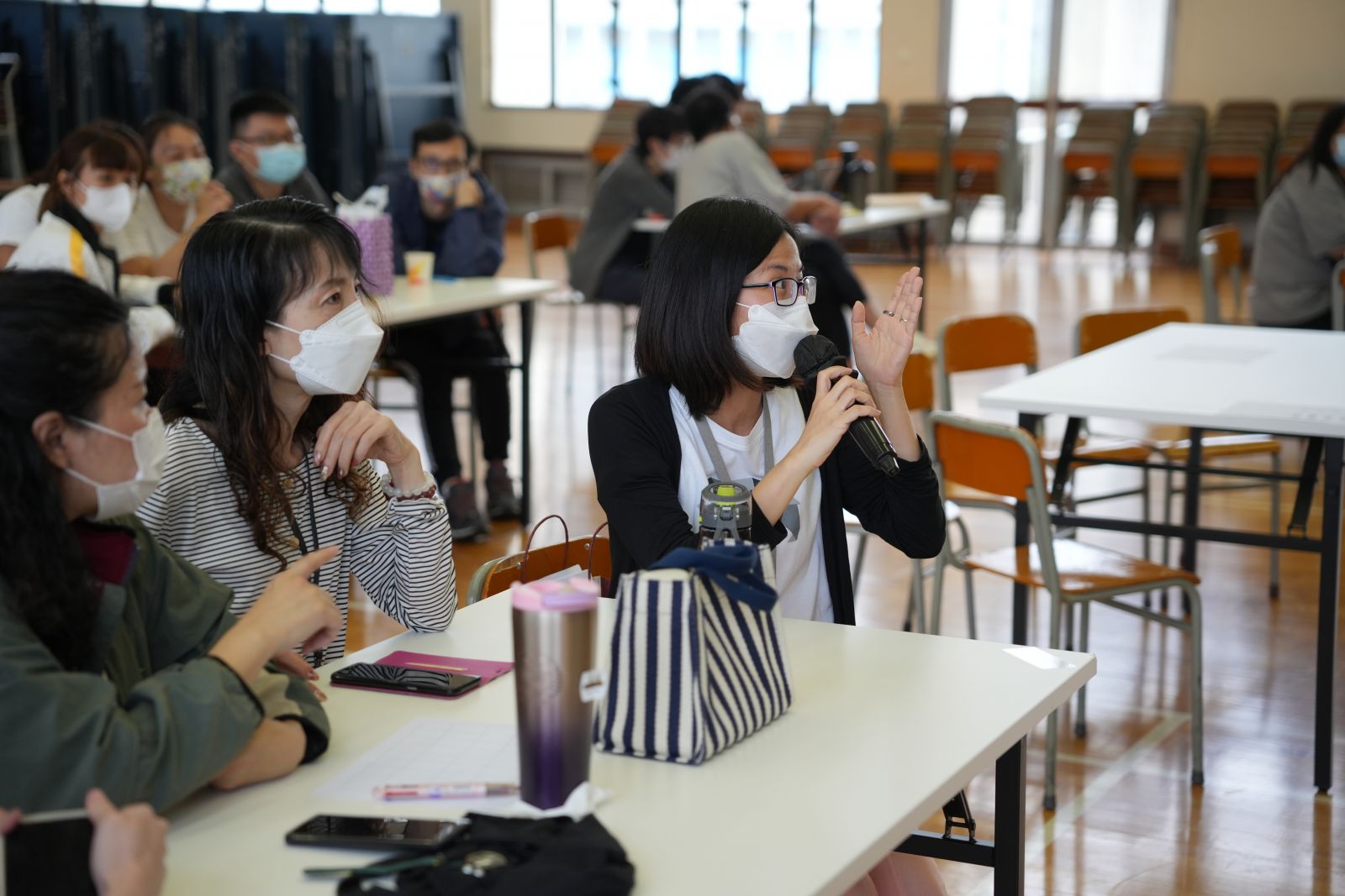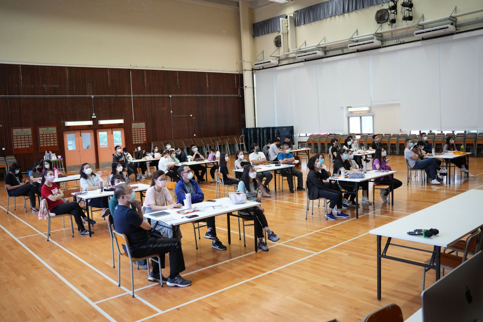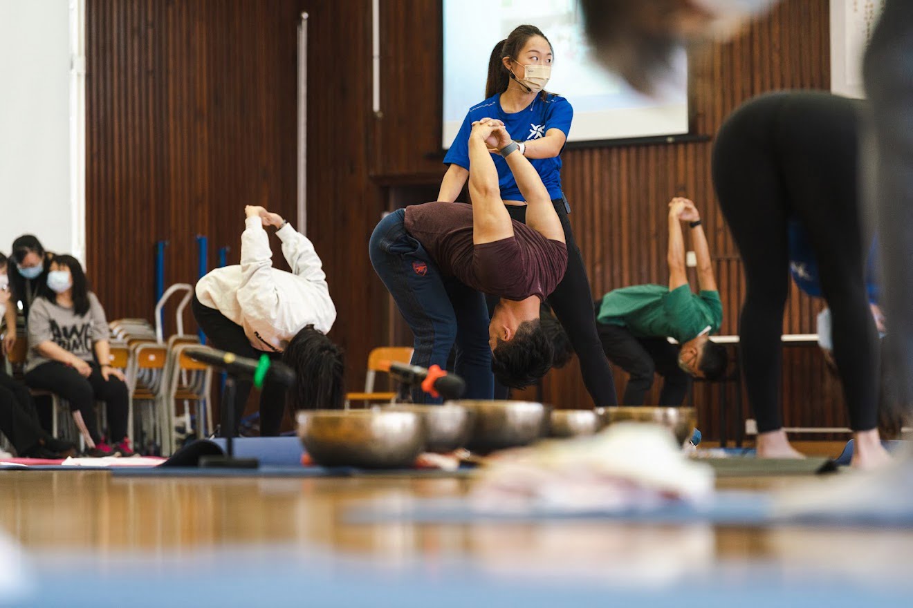 校方請來兩位專業瑜伽導師,帶領全體老師先來進行一系列較動態的瑜伽動作,以舒展肋骨,隨後進行較静態的睡眠瑜伽,伴以頌砵的聲音治療,一解老師們因日常生活及工作所致的身心疲累,實乃一次嶄新且奇妙體驗。